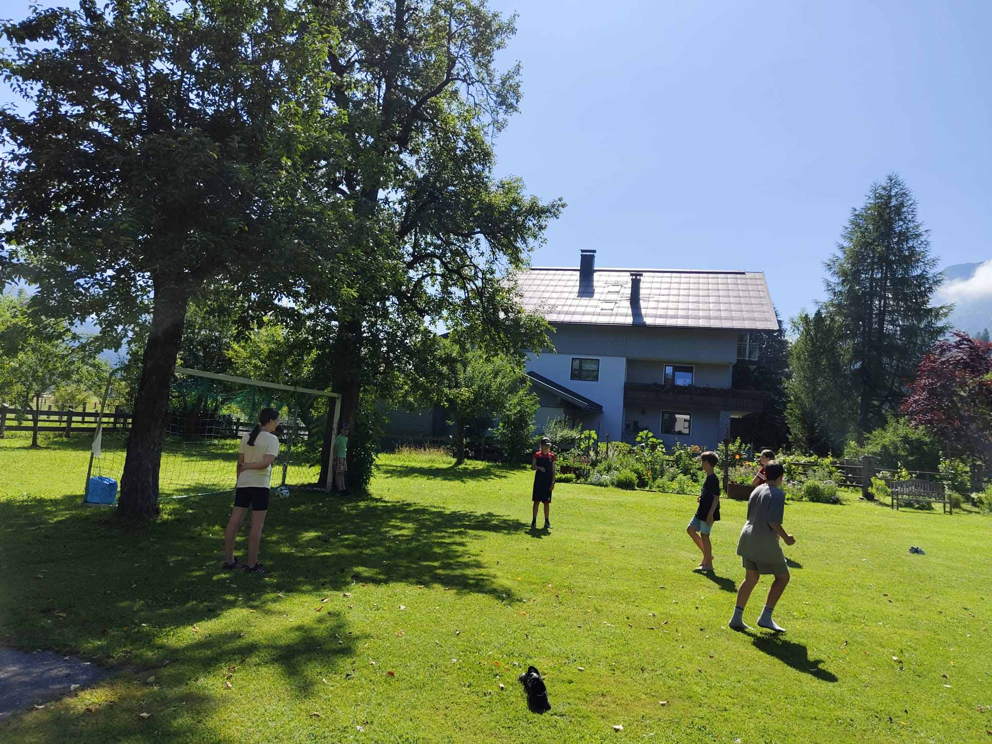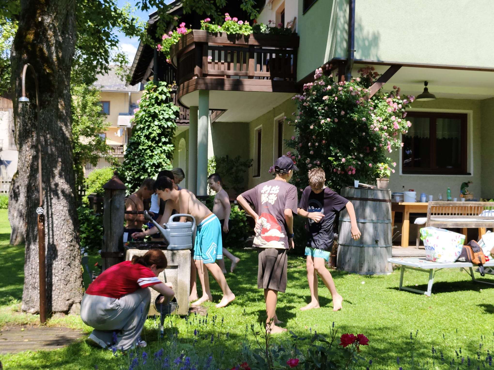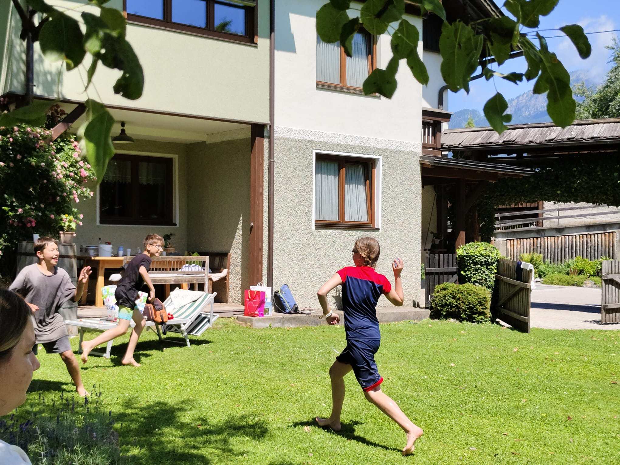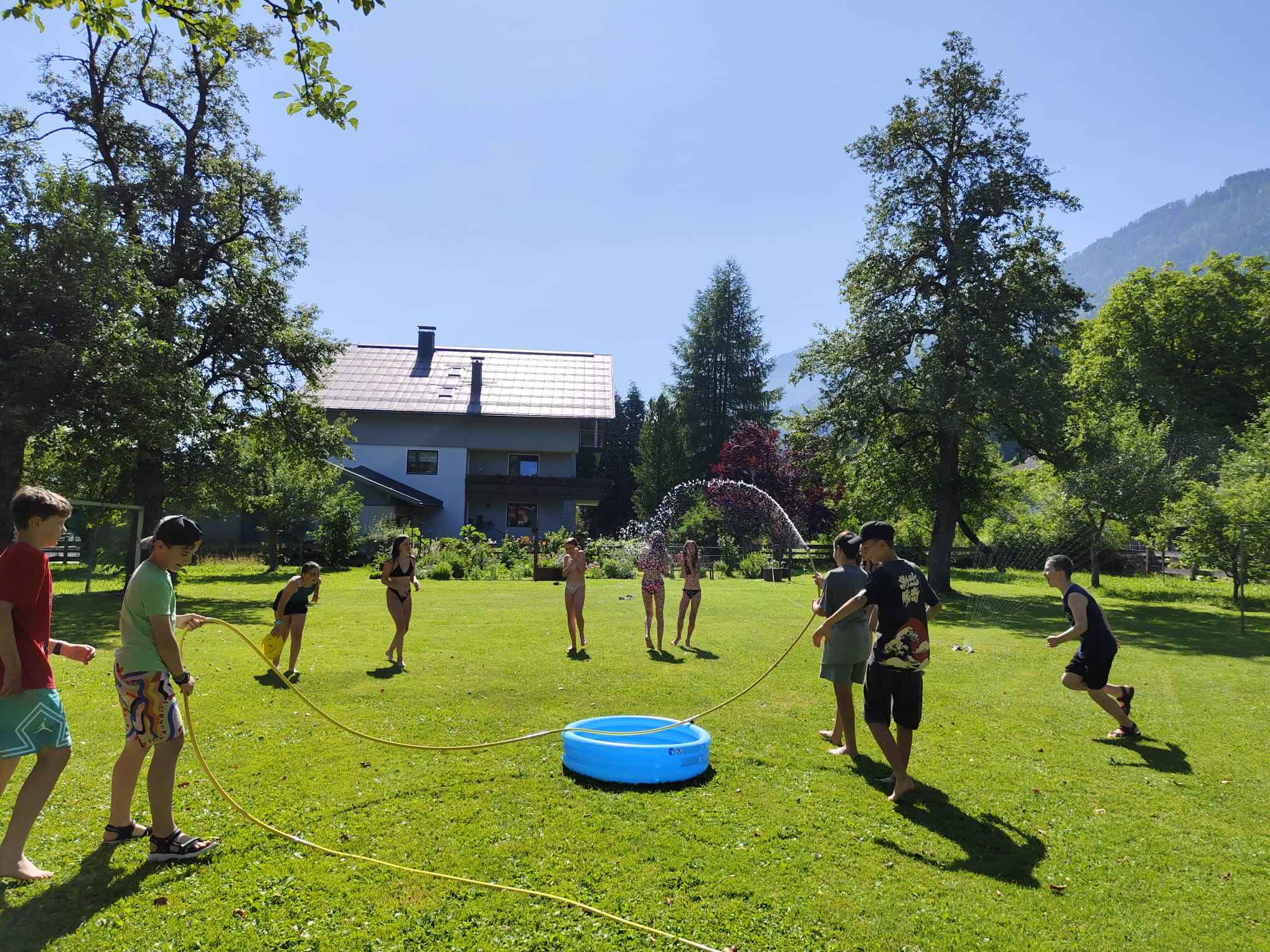 Dort erwartete sie ein abwechslungsreicher und fröhlicher Vormittag. Im großzügigen Garten konnten sie Fußball und Federball spielen, sich beim Wassersprenger oder mit Wasserbomben abkühlen.