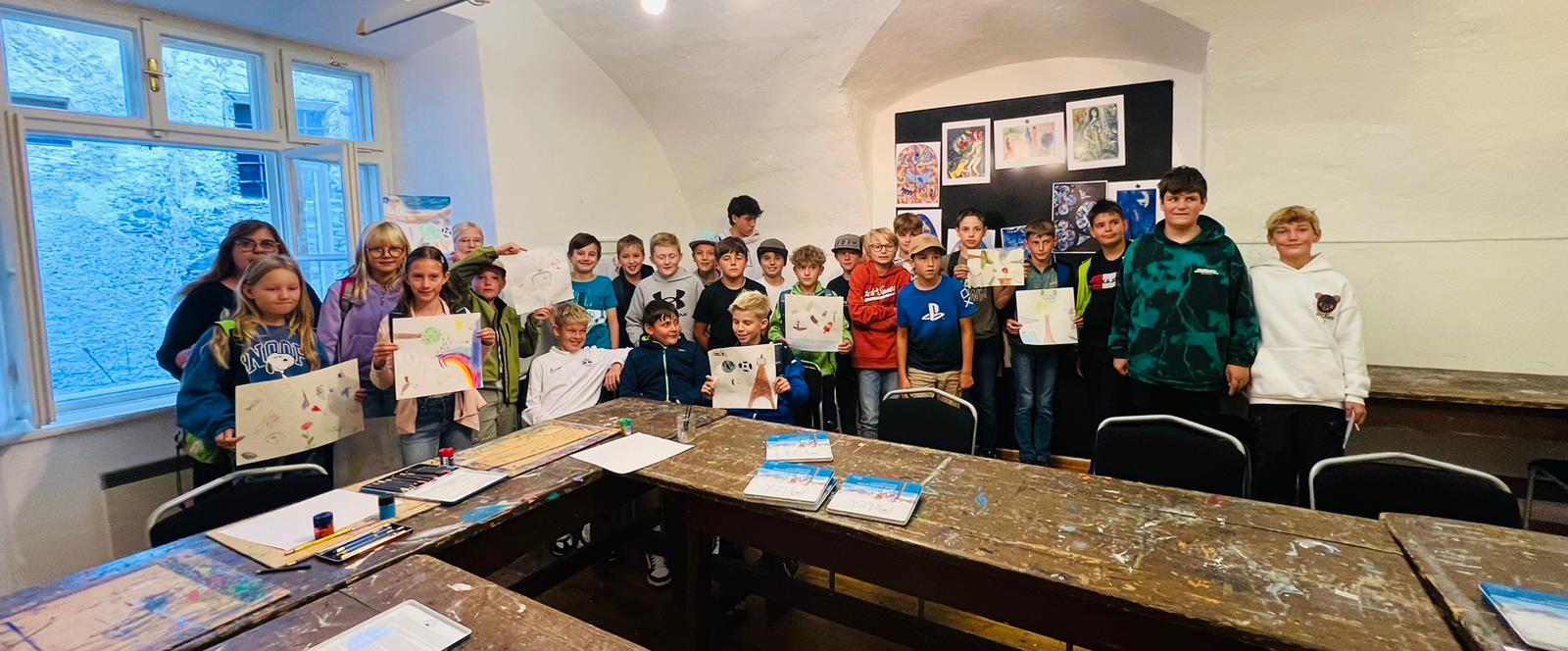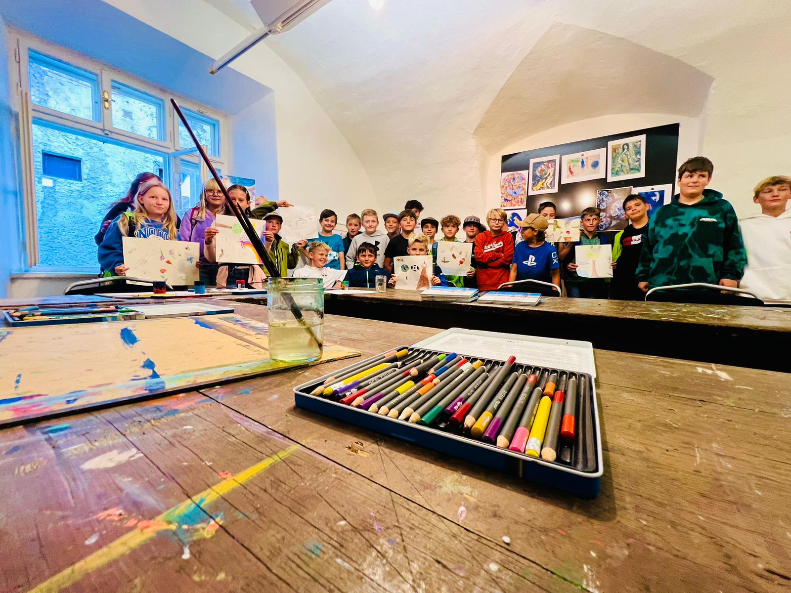 Inspiriert von Formen und Farben arbeiteten die SchülerInnen anschließend an eigenen Bildern in der Malwerkstatt.