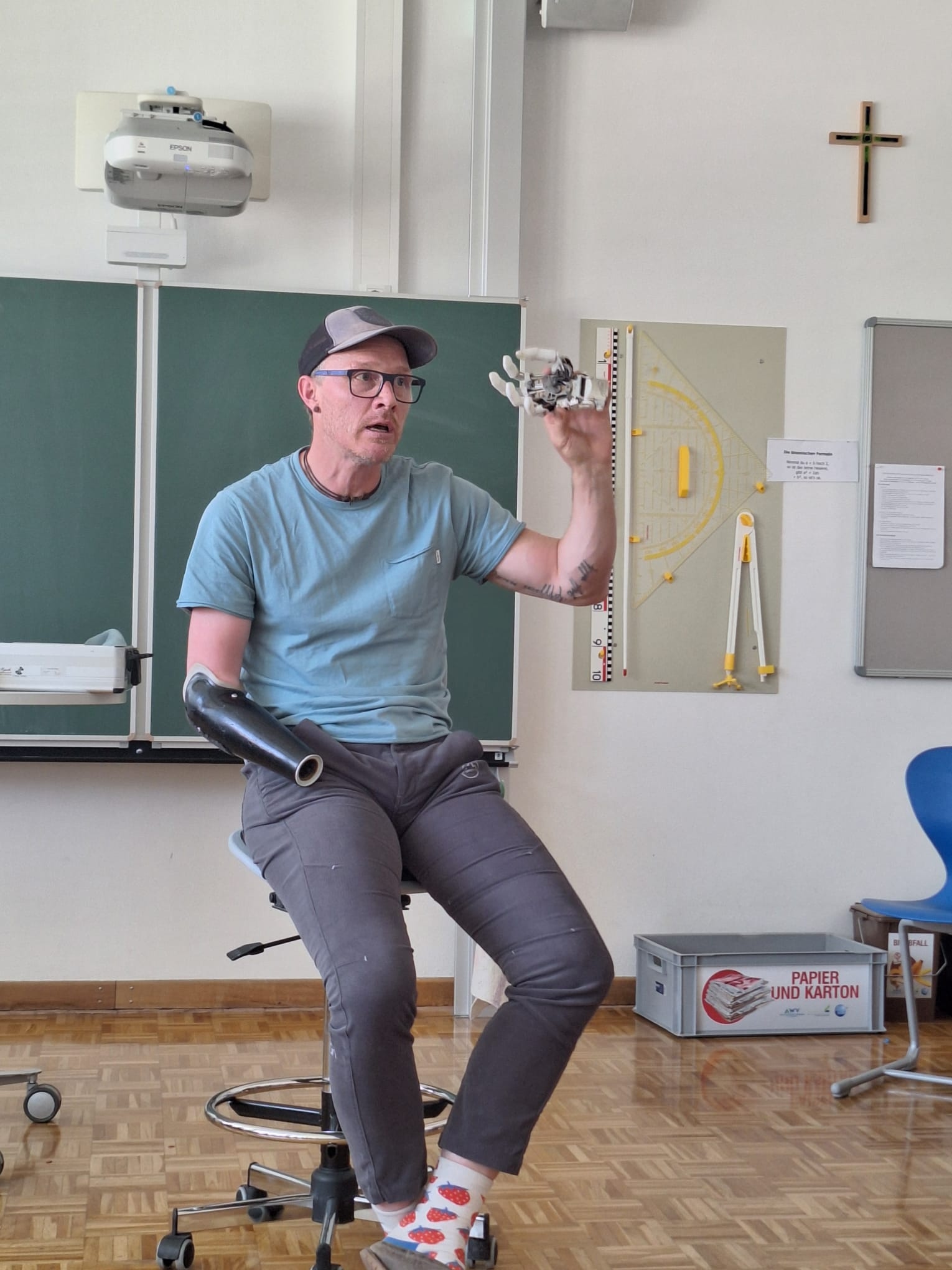Mit viel Herzblut gab Klaus Feistritzer, der im Alter von drei Jahren seinen rechten Unterarm verlor, im Zuge des Unterrichtsgegenstandes „Berufsorientierung“, Einblick in seinen Lebenslauf. Nach dem Besuch der damaligen „Hauptschule“, machte er verschiedene Berufserfahrungen: vom Zusteller bei der Post, als Erntehelfer auf großen Plantagen in Australien bis hin zum Snowboardlehre. Mit 25 Jahren begann er eine Lehre als Elektriker und Mechatroniker, absolvierte nebenbei die Abendschule, die er mit Matura abschloss, baute mit seinem Freund eine heimische Brauerei auf und schloss im Jahre 2025 die Ausbildung zum Mechatronikmeister ab. Genau dieser Werdegang soll unseren Schülern, laut Klaus, zeigen: „Wenn du etwas willst, ist alles möglich.“ Besonders beeindruckt hat unsere Schüler, als er über den Umgang mit seinen verschiedensten Armprothesen erzählte und diese zeigte.