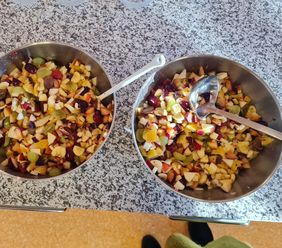 Verschiedene Obstsorten wurden von zu Hause mitgebracht, gewaschen, geschält, geschnitten und zu einem ausgezeichneten Obstsalat verarbeitet.
